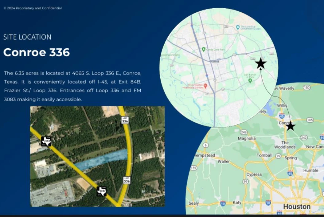 The site is located at 4065 S. Loop 336 E, Conroe, Texas, near I-45 at Exit 84B, with access from Loop 336 and FM 3083.